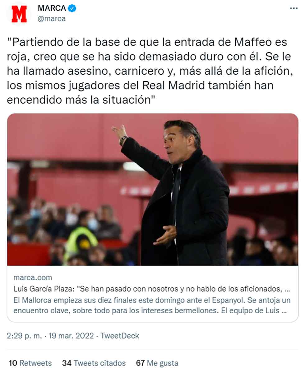 Sr. García Plaza, ruego que nos diga nombre y apellidos de los futbolistas del Real Madrid que han encendido la situación y especifique qué han hecho para merecer esa acusación. Nadie del equipo blanco ha llamado carnicero ni asesino a Maffeo. Nadie. El digno gremio de los carniceros tampoco merecería afrenta de tal calibre, por otra parte. Ahora bien, si usted nos cuenta que un señor, pongamos de Benidorm, se lo ha llamado en la soledad de su casa gritándoselo al televisor, pues tal vez, pero se trata de un hecho irrelevante para la causa, con total seguridad algún aficionado mallorquinista proferiría barbaridades en sentido contrario. Es probable que alguien también haya llamado asesinos al grupo ultra del equipo en el que usted se formó después de que estos lleven a sus espaldas dos muertes con la absoluta pasividad del club; ¿también esto enciende la situación contra el Frente Atlético? Es execrable culpabilizar a la víctima y exonerar al agresor, Sr. García Plaza, y mentir con tal propósito, más.