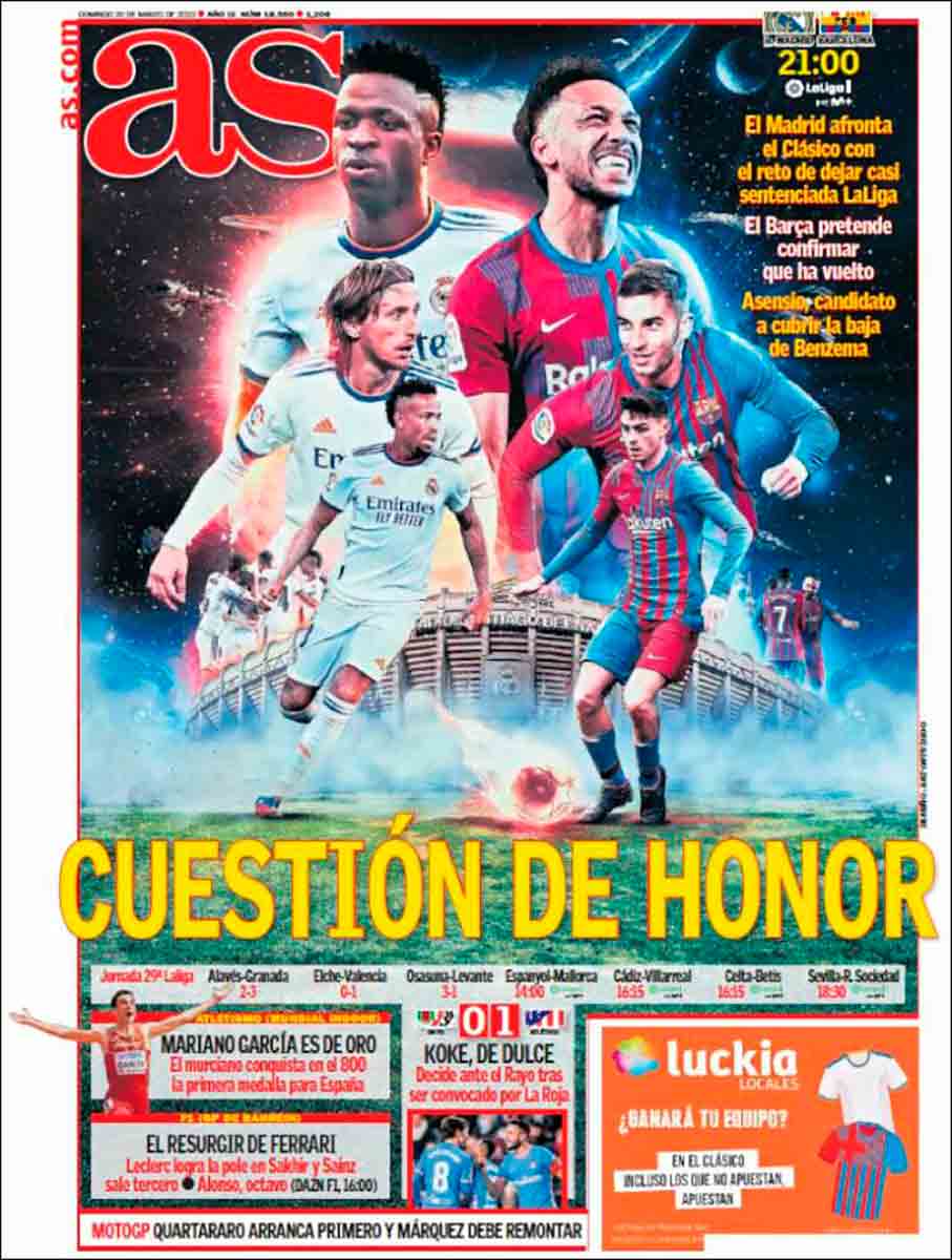 As, empero, sí acierta con el titular: “Cuestión de honor”. Es lo que se juegan ambos equipos, porque suceda lo que suceda no será crucial para ninguno de los dos. El diseño, sin embargo, parece el de un poster psicodélico —solo contemplable con gafas de sol polarizadas, de las que polan, como decía Gila—, esos que puedes adquirir en la tienda casi 24 horas de debajo de tu casa, la regentada por un chino muy amable que lo mismo te despacha una barra de pan que te cambia la batería del móvil o te vende fusibles piratas para un KIA Carnival 2.5 V6 LS 5p de 1999.