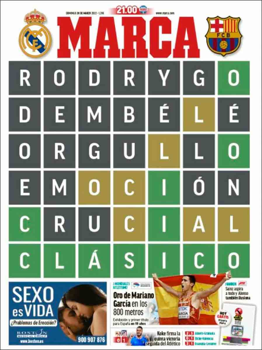 La portada de Marca es igual de ilusionante de cara al clásico que la germinación de las semillas del brócoli. Los de Gallardo han optado por reproducir en su primera plana el Wordle, un juego de palabras similar a un programa de televisión presentado por Ramoncín en los años noventa del siglo pasado (ver Lingo). No confundir con Berlingo, que es una furgoneta y tiene la misma relación con el clásico que la portada de Marca.