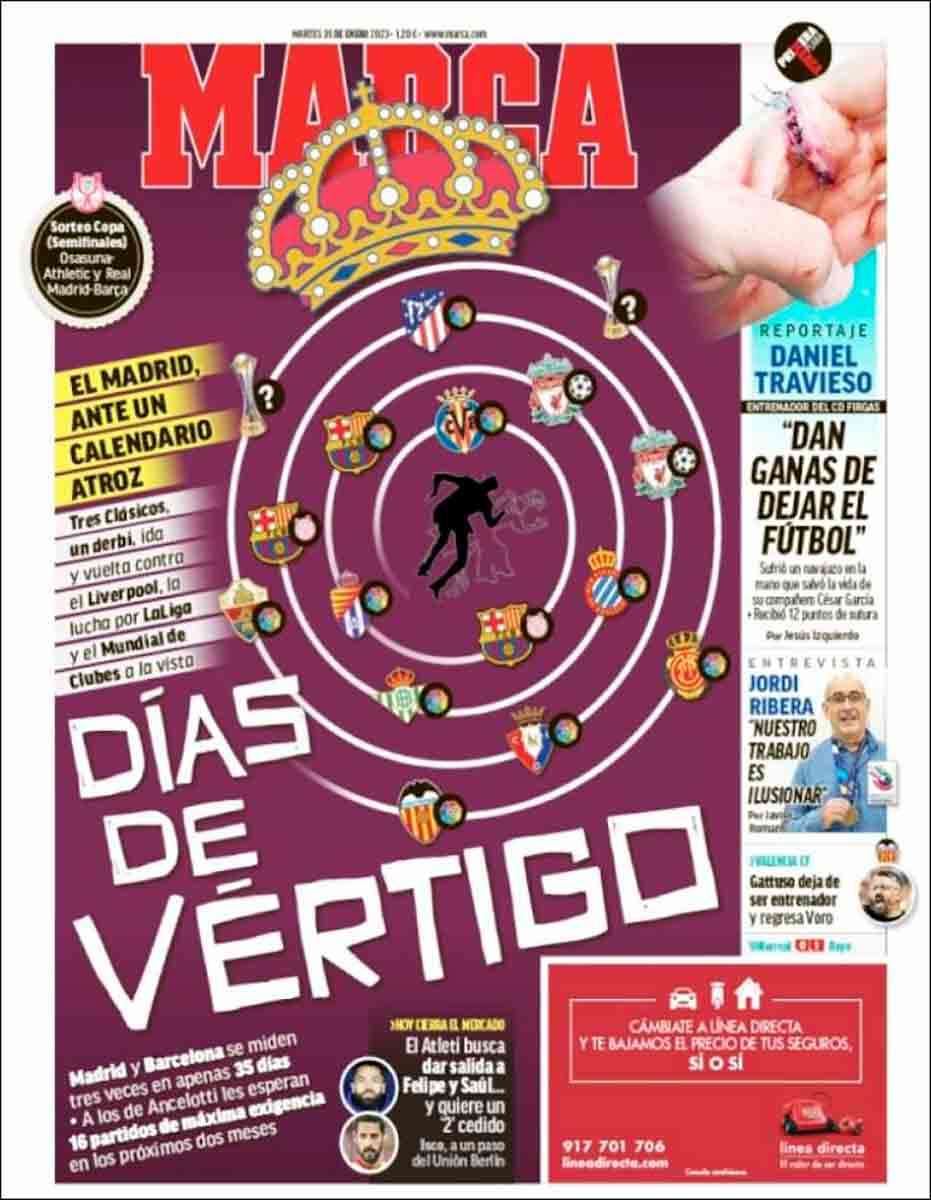 Buenos días, amigos. Ayer se celebró el sorteo de las semifinales de Copa del Rey y las bolitas decidieron que se enfrentaran Osasuna y Athletic por un lado y —lo que nos interesa— Real Madrid y Barcelona por otro. Si tiramos del refranero podemos decir que éramos pocos y parió la abuela, los de Ancelotti se enfrentan a un calendario de vértigo, como asegura Marca en su hoy sí acertada portada en la que recurre al clásico de Hitchcock.