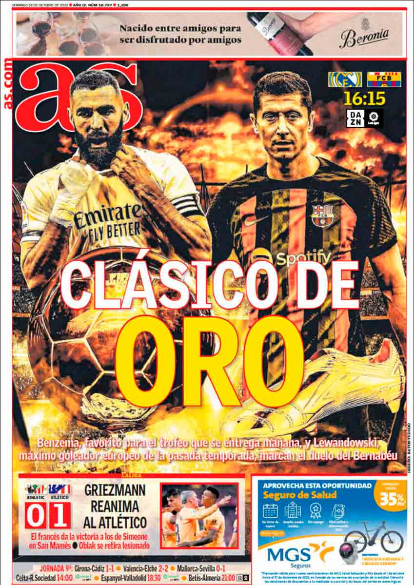 As no le va a la zaga. Si ayer nos mostraba futbolistas con aspecto moribundo, hoy han sobrepuesto a unos achicharrados Benzema y Lewandowski sobre una imagen apocalíptica de Terminator. Explosiones, llamas, oro falso. Bienvenidos al circo del mal gusto. Tratemos a los aficionados como si fuesen acéfalos amantes de los fuegos de artificio de todo a un euro. Hace tiempo que el diseño de las portadas de As es bochornoso.