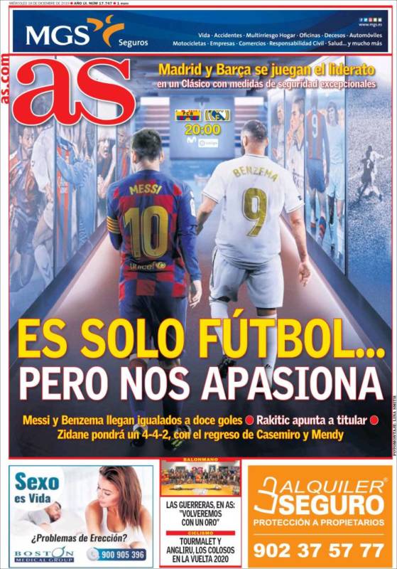 “Más que un Clásico”, dice Mundo Deportivo. Véase cómo, subliminalmente, se emparenta el partido con aquel otro slogan de corte marcadamente político: “més que un club”. Por qué “Más que un Clásico, nos preguntamos, como si un Clásico no fuera por sí mismo lo suficientemente grande, como si amenazado por tsunamis varios alcanzara su verdadera expresión, lo que no quieren decir abiertamente pero sí nos sugieren: Cataluña contra España (o contra el resto de España). No, no es más que un Clásico. Es (o será, si es que se juega) sólo un Clásico.
