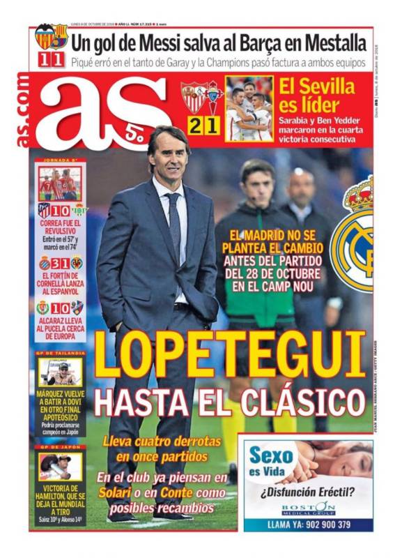 Buenos días. A Julen Lopetegui ya le han puesto fecha de caducidad. En realidad, dijeron que su puesto peligraría si no se ganaba al Alavés, pero el Real Madrid perdió, Florentino Pérez no tomó ninguna decisión drástica y toca marcar de nuevo el calendario. En esta ocasión, el choque que, parece, servirá de punto de inflexión será el Clásico del 28 de octubre.
