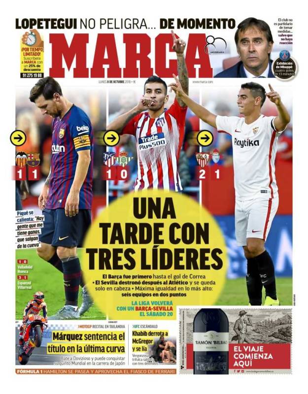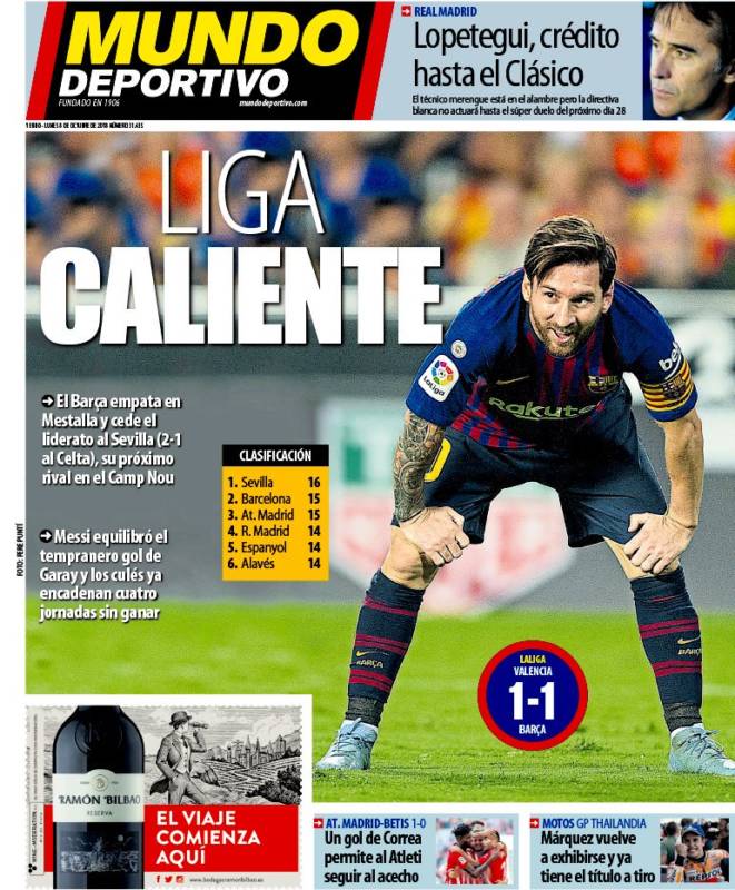 En Barcelona no les va mucho mejor. Los de Ernesto Valverde sólo sacan dos puntos al deprimido y desastroso Real Madrid, pero allí le dedican portadas a Leo Messi y con eso ya está todo solucionado. El argentino les sirve para tapar el Sol con un dedo. No juegan a nada, no transmiten nada, se muestran como un equipo opaco y tibio, pero Messi es Messi y ver al Real Madrid peor les da alas. Así son.