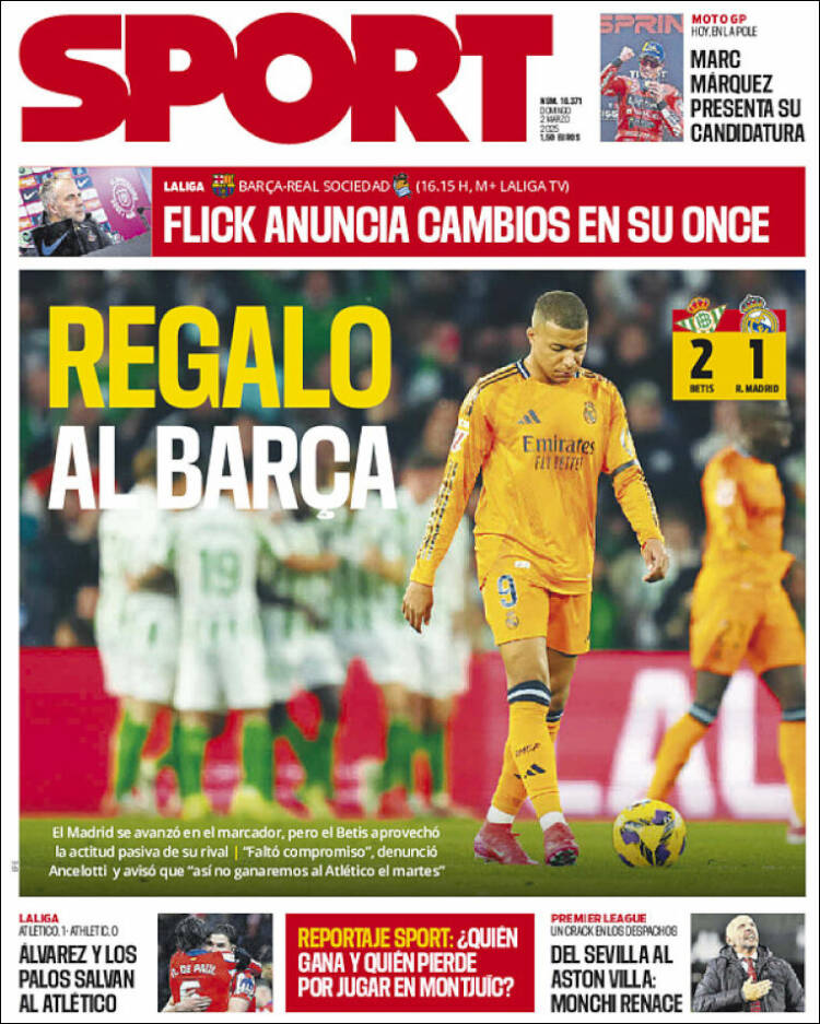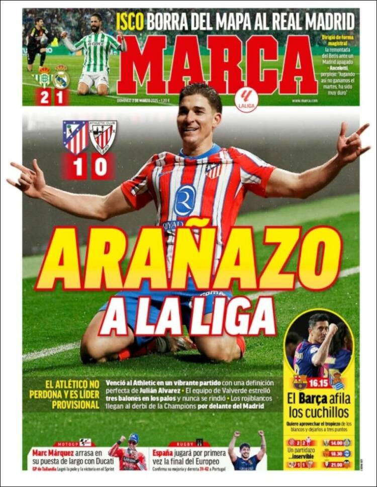 El Atleti, por su parte, no desaprovechó la ocasión y nos adelantó en la tabla gracias a una pírrica victoria contra el Athletic Club, que mereció mucha mejor suerte y estrelló ¡3! balones en la madera. Julián Álvarez, conocido como La Araña, marcó el único gol, de ahí el juego de palabras de la portada. Precisamente (lo juro) este portanalista ha soñado esta noche con una araña enorme a la que no podía matar por estar descalzo y no encontrar zapato alguno a la vista. A ver si el zapato perdido va a ser Asencio, que ayer desapareció de la alineación de Ancelotti por causas que solo él conoce. ¿Descanso? ¿Miedo a que vuelva a sufrir insultos? ¿Le convence más el renqueante Alaba?