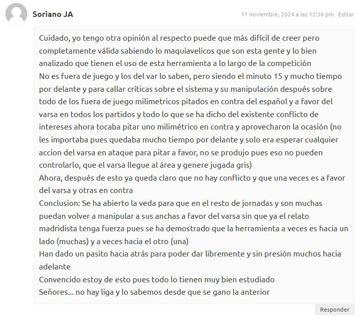 Me enorgullece saber que mi comentario esta teniendo eco pues además de en este portaanalisis se que también ha llegado a X, me enorgullece pues me hace saber que por mas conspiranoico que pueda parecer no es mas que un sentir de los madridistas los cuales ya estamos hartos de ver una y otra vez tal y como se cita mediante ejemplos en este articulo (hay muchos mas) que nuestro Madrid se vea perjudicado ya sea de forma directa o indirecta (favores al tramposo) y además tengamos que tragar una y otra vez con el relato que propaga el altavoz del VARsa que son todos los medios de comunicación (por eso no necesitan una TV propia), TODOS (cuando hablan de la caverna me da una risa tremenda), relato que llega todos los aficionados hipnotizados por esta manipulada información los cuales se permiten luego opinar sin ni siquiera ver los partidos (inviable por el precio de futbol, "el futbol es de los aficionados, según Tebas "el madridista") y opinan bajo el convencimiento que el Madrid es el favorecido y tenemos intervenido todos los estamentos, y esto es inadmisible e irritante cuanto menos, por mas que uno quiera es algo a lo que no te acostumbras e imposible pasar por alto.