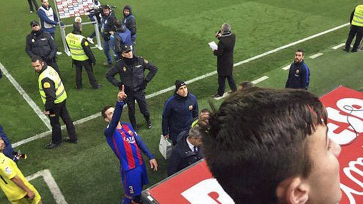 Las preguntas se amontonan pese a lo escueto del mensaje (por ejemplo, claro, “no empecemos” a qué, por qué se siente Piqué víctima de nada), y el lenguaje corporal de la escena no hace sino acrecentar nuestra perplejidad. Porque no solo Gerard le dice al colegiado que no empecemos, sino que se lo dice con el dedo enhiesto, apuntando en dirección a su cara en ademán admonitorio o retador. “No me señales con el dedito”, le responde el objeto de su acoso, en un intento enternecedor de mantener un atisbo de autoridad. Su voz no nos llega, es solo una secuencia de imágenes subtituladas lo que se nos ofrece, pero intuimos un hilo de voz trémulo, como el del progenitor ingenuo ante el poder supremo del pequeño dictador. A qué hora vas a volver a casa. A la que me salga de los cojones. Va... vale, pero ni un minuto más tarde.