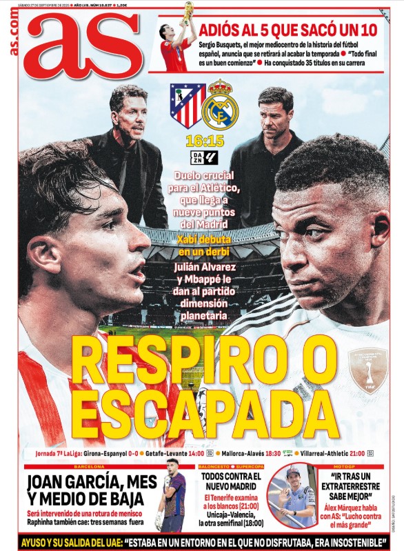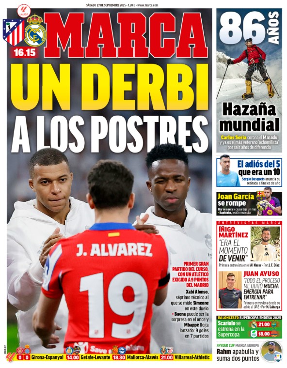 El Real Madrid llega lanzado, con pleno de victorias y buen juego, con nueve puntos de ventaja sobre un Atleti que no termina de carburar. Esta vez no valdrá la excusa del presupuesto, pues los locales han gastado más que los visitantes en el último mercado de verano. 176 millonacos de euros por 167 de los nuestros. Aun así, el Atleti se ha recuperado levemente y llegará reforzado al derbi tras el hat-trick de Julián Álvarez y su habitual buena forma/suerte arbitral. Contará con todos sus efectivos, incluidos los perdonados Koke y Llorente, más el recuperado Baena y el siempre peligroso Alberola Rojas. El adolescente al que le gustaban “las chicas altas, rubias y delgadas” es ahora el mayor exponente de los árbitros cachitas y chulescos que se lucen cada semana en la MLN. Esperemos poder disfrutar de los tres artistas del balón que aparecen en la portada del diario madrileño y no tener que hablar mañana de Alberola. Lo dudamos. Mucho.