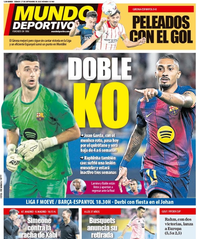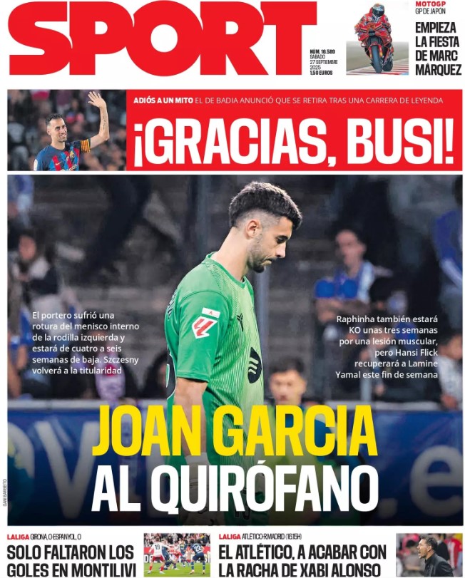La prensa cataculé se centra en dos noticias: la lesión de Joan García, al que deseamos una pronta recuperación, y la retirada de Sergio Busquets. Adiós a un gran centrocampista que hizo carrera en la época más negreira de nuestro fútbol, unos años en los que sus mediocres dotes de actor fueron muy bien valoradas por la cúpula arbitral.