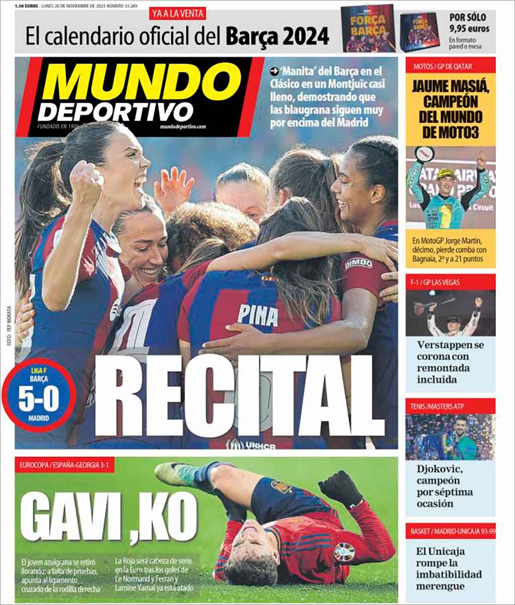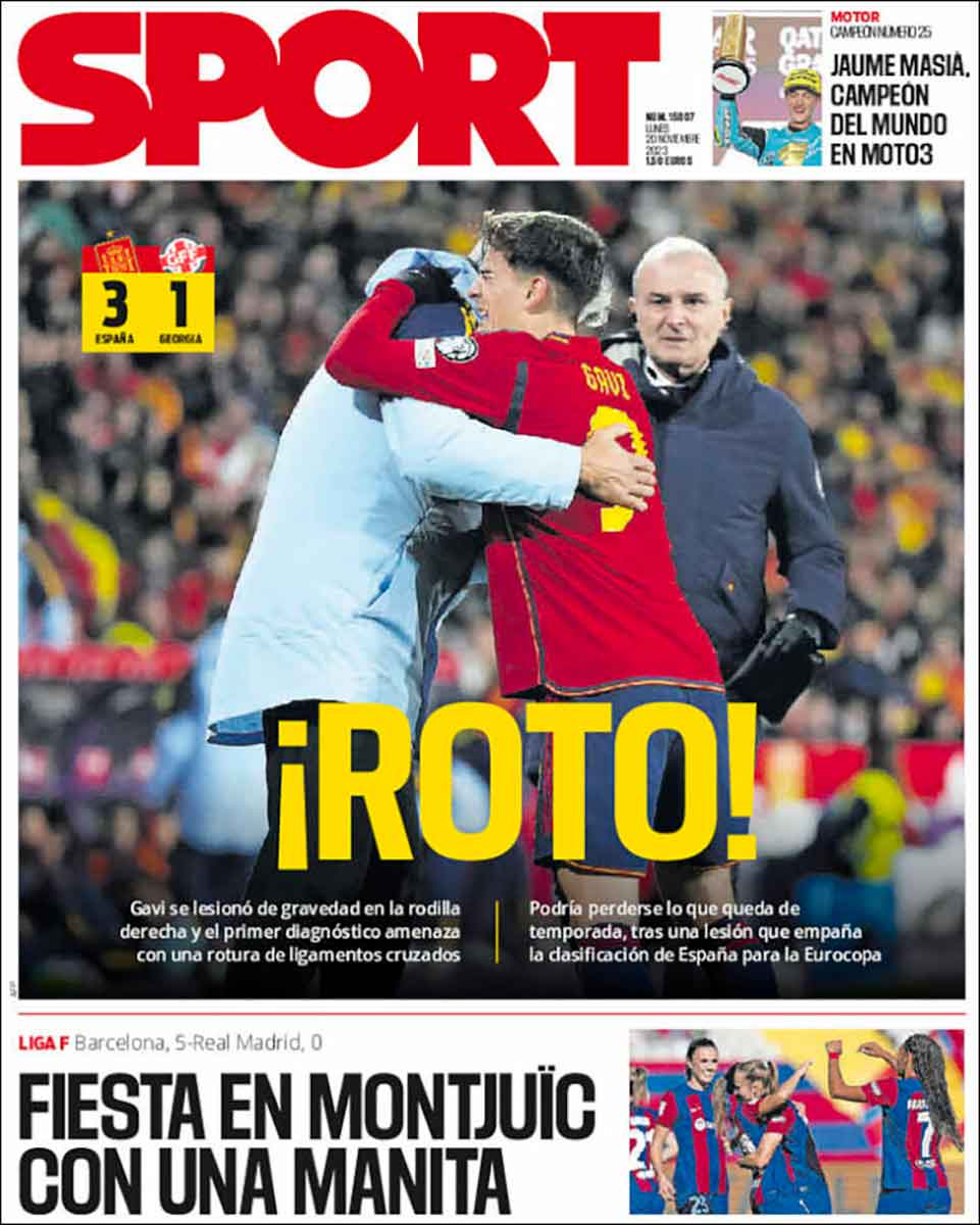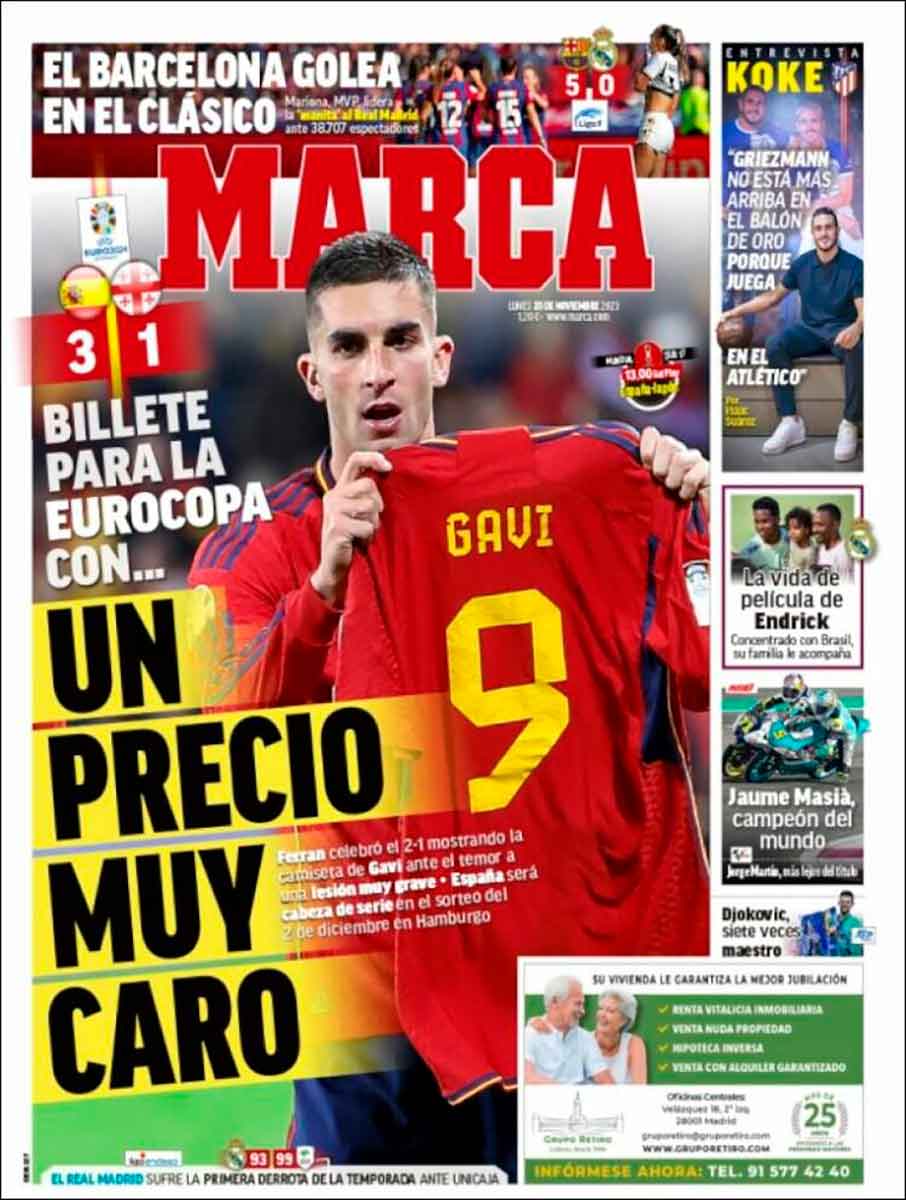 El resto de rotativos hacen hincapié en la lesión de Gavi, a quien mandamos nuestro ánimo. Llevamos días insistiendo en la necesidad de poner fin al derecho de pernada de la FIFA en los parones, sin que nos importe qué club sea el que pague el sueldo del jugador. Esto tiene que acabar. Ha tenido que ser un futbolista de la selección española el perjudicado para que los medios nacionales pongan el grito en el cielo. Bien está mientras de una vez lo pongan. Los medios reciben abundantes rentas de la Federación, que vive de estos bolos infames, y tienen en este sentido secuestrada su independencia. Hablábamos antes de la necesidad de un plante por parte de clubes y profesionales. Los medios también deberían plantarse.