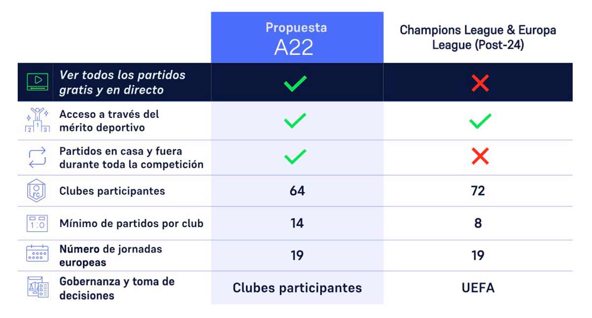 El Tribunal, en definitiva, ni se ha pronunciado ni se esperaba que lo hiciera sobre lo que después, en streaming seguido por millones de personas, ha explicado Bern Reichart, CEO de A22, empresa organizadora de la Superliga. Habrá que ver si lo que ha explicado prende el interés de los clubes, pero todo hace indicar que lo hará. Muchos clubes europeos ya llevan tiempo discutiendo el esquema de la nueva competición con Reichart, y lo que ha explicado es tan convincente como de cajón: tres divisiones de Superliga a las que se accede (o de las que te descuelgas) por estricta meritocracia, un papel todavía importante de las ligas nacionales y un gran espectáculo gratuito para el espectador, que ya no tendrá que abonarse a cincuenta plataformas inextricables sino que gozará de los mejores partidos semana tras semana a través de plataformas de streaming que se autofinanciarán a través de los ingentes ingresos publicitarios derivados del megaproyecto.