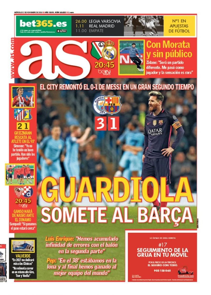 En 'Mundo Deportivo', la línea del silencio es casi idéntica a la de 'Sport'. Aquí no ha pasado nada y hay derrotas que no escuecen. Hablan de "gran primera parte" y de un Manchester City que ganó al contragolpe, como si quisieran volver a quitarle mérito a ese estilo de juego ahora que ellos no han podido sacarle provecho. Un diminuto "apagón" que obliga al Barcelona a sudar un poco más para terminar primero de grupo y poder jugar la vuelta de octavos de final de la Champions League en el Camp Nou.
