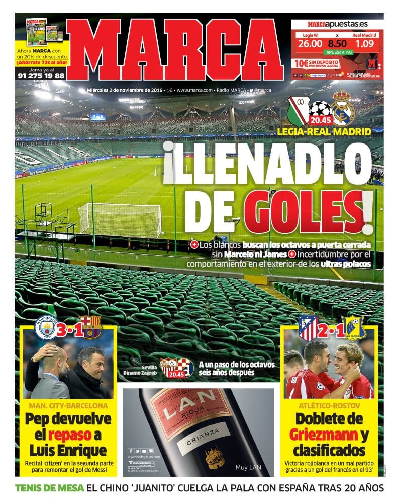 En la prensa madrileña encontramos una convincente mezcla entre lo que hay hoy -el Legia-Real Madrid- y lo ocurrido anoche con Atlético de Madrid y Barcelona. Habrá que celebrar que, al menos este miércoles, 'La Ouija Today' no se lía la manta a la cabeza con una de esas portadas hilarantes que agitan todo y nada a la vez. Lo importante es que a las 20:44 sonará el himno de la Champions League en un estadio vacío, pero con once Copas de Europa sobre los hombros de los jugadores del Real Madrid. Los octavos de final esperan a la vuelta de la esquina.