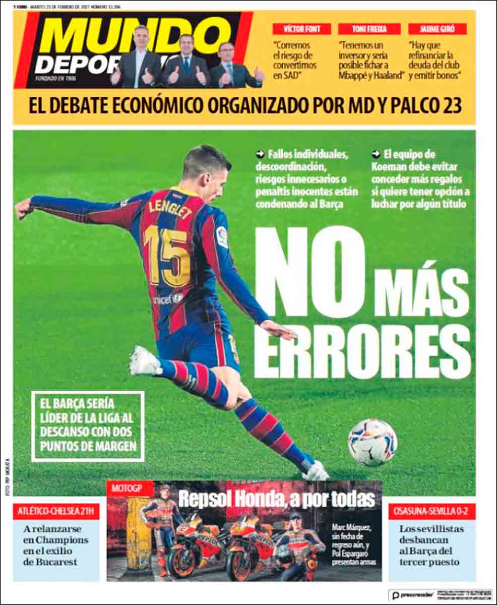 Por lo visto, como no se quedaron a gusto con el recuadrito, dedican la portada al empujador de Les Corts (Lenglet, para los amigos), y titulan “NO más errores”. Entendemos que se refieren a que no se puede permitir errores como los comentados en el Portanálisis de ayer: si Lenglet empuja a un rival para que invada el área contra su voluntad (la del rival) durante un penalti contra el Barça, no puede ser que no se efectúe bien la maniobra inmoral, hay que llevarla a cabo en condiciones para que el árbitro anule el gol del equipo contrario. Recomendamos al empujador de Les Corts que vea vídeos de cómo introducen en Japón a las personas dentro de los vagones de metro.