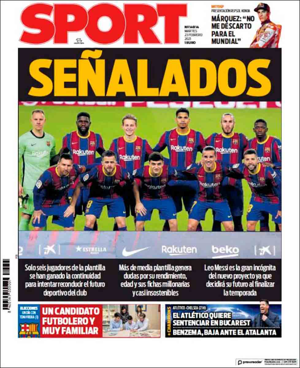 Es extraño, pero Sport aporta una nota de sensatez al aroma de la prensa catalana. Bajo la formación de un once titular azulgrana de la presente temporada, destacan el mal estado de forma de la mayoría, sus fichas insostenibles y la duda que genera Messi al no decidir aún (públicamente) su futuro.