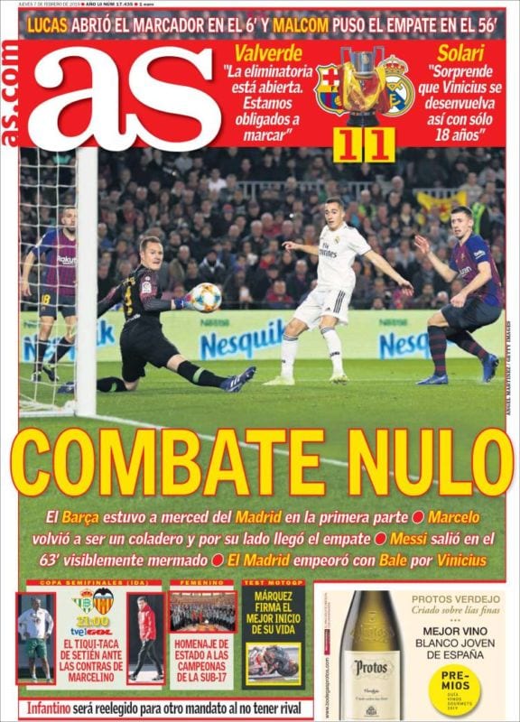 Buenos días. Hemos empatado en el Camp Nou y hemos marcado. A priori, son dos buenas noticias en una. Todos habríamos firmado, antes de jugar esta ida de semifinales de Copa, cualquier empate con goles. Lo agridulce del partido reside en el mal momento mostrado por algunos jugadores importantes de la plantilla, con Marcelo a la cabeza, así como en la verbena defensiva que supuso el gol culé, un carrasclás de desatinos con Sergio (homérico en el resto de jugadas) haciendo un exceso de vista en el remate de Malcom y Keylor (por lo demás espléndido) tardando una vida (pura) en volver bajo los palos después de una salida en semifallo, por no hablar del trote cansino de Marcelo observando de lejos el desarrollo de toda la jugada (crónica de Quillo Barrios aquí). Estas cosas irritan porque son evitables y, de no haberse dado, habrían desembocado en una victoria importante y muy merecida. No hubo tal, aunque el empate sea un resultado halagüeño que lo deja todo en el aire, como titula Marca sin echarle demasiada imaginación.