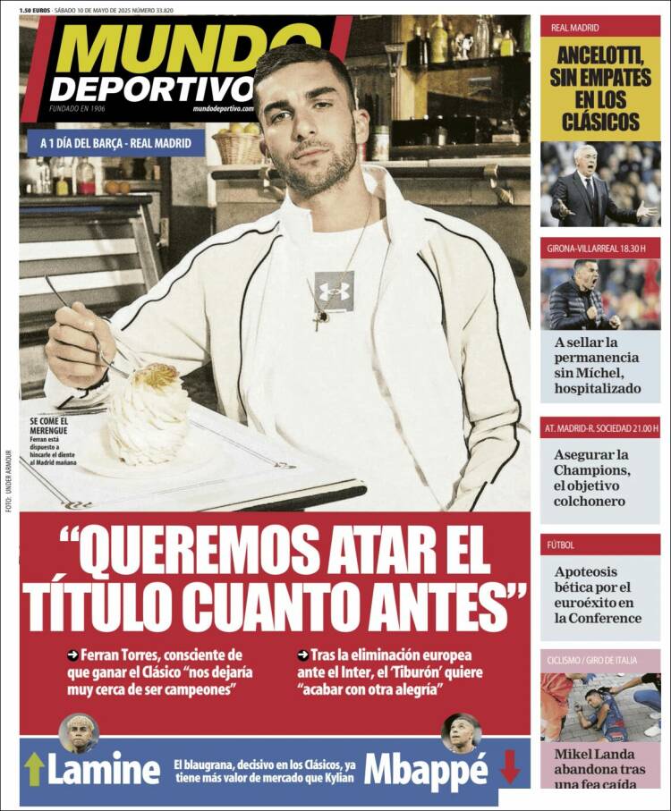 Mundo Deportivo, por su parte, muestra a Ferran Torres todo vestido de blanco y comiéndose un merengue. Esperemos que esta imagen no os conduzca al equívoco de pensar que este gente vive obsesionada con el Madrid, presa de un complejo existencial agravado por la realidad continental: 6 Champions de los llamados merengues por 0 (cero) Champions propias. A ver si el merengue se le va a indigestar al bueno del Tiburón.