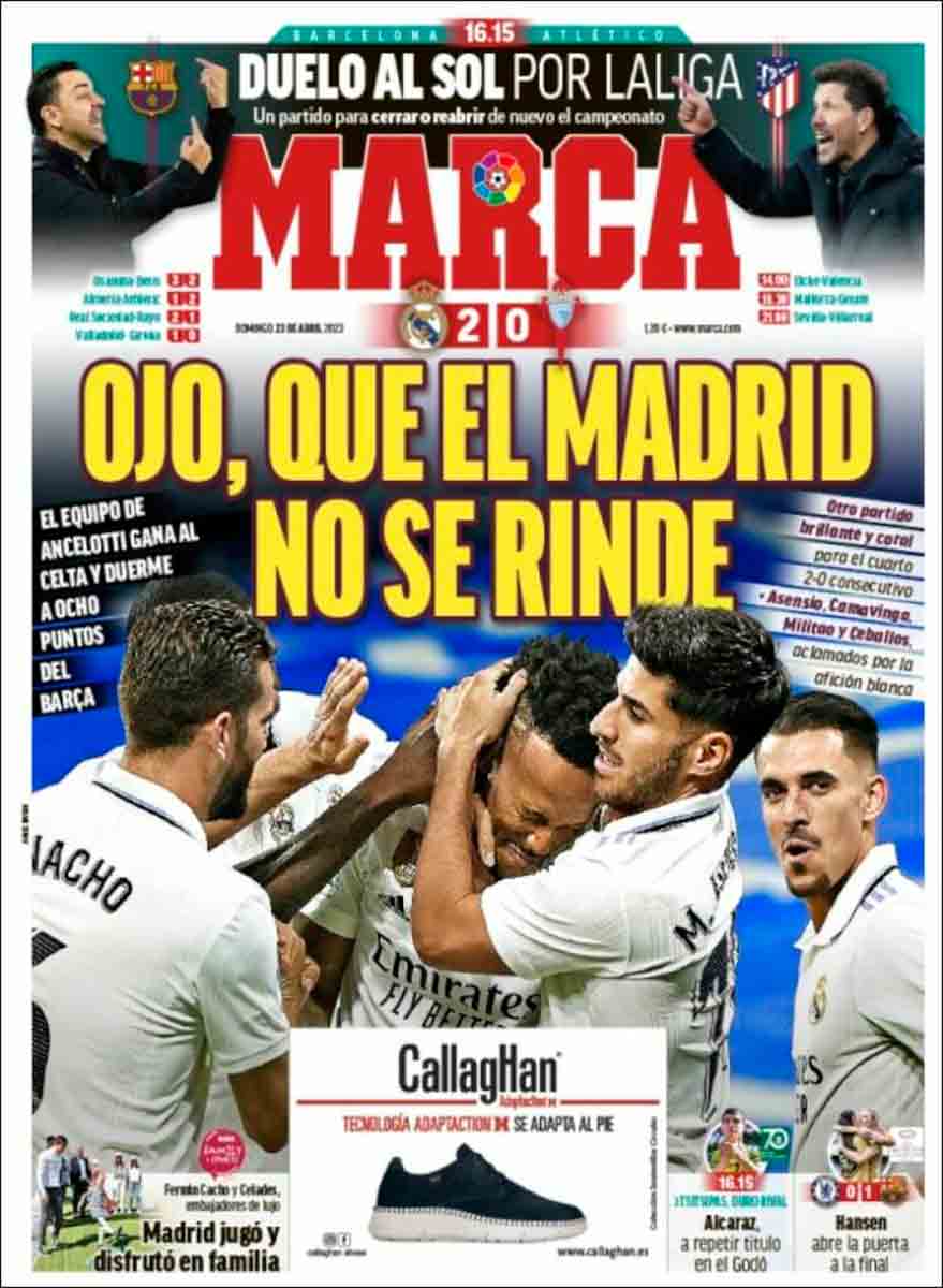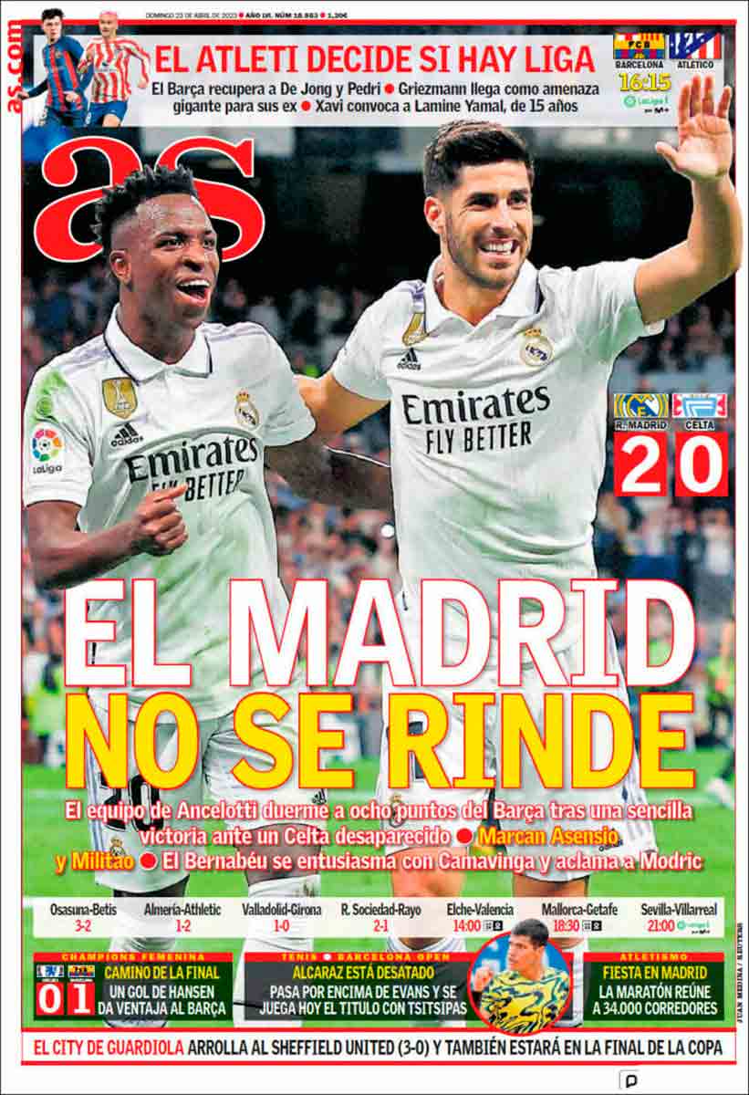 Este no dormir del Madrid, este brand new start que actualiza a cada paso implica que no se rinde, faltaría más, y así lo lleva a titular la portada de As, ilustrada con la unión de Vini y Asensio tras gol del balear contra el Celta. Lean, por cierto, la crónica de Ramón Álvarez de Mon. Casi repite el gesto el diario Marca, aunque su foto de portada recoja la celebración del segundo gol (cabezazo canónico de Militão, sí, el mejor central del mundo) y ya no del primero, y aunque añada a su frase un "ojo" inicial que podría parecer de entrada dos cosas: bien un aviso al Barcelona, una señal lanzada desde la misma meseta para que no se relajen los de Xavi, hijo de la noche; o bien una señal de sorpresa, como si en Marca asombrara la no rendición del Madrid, como si pensaran que lo propio, lo normal, lo que la situación pide fuera precisamente rendirse.