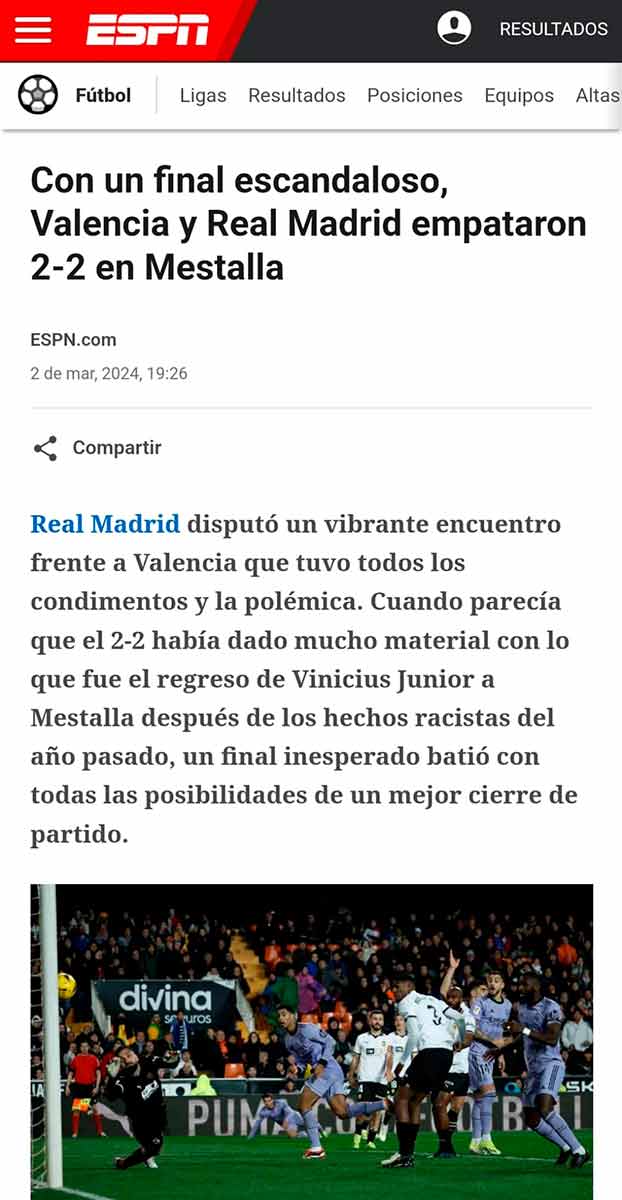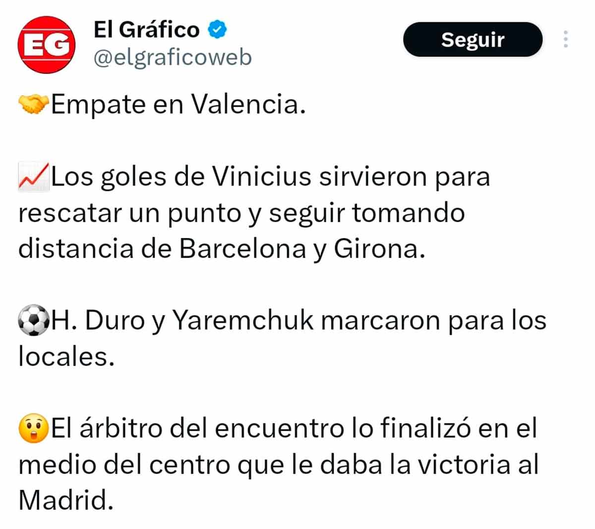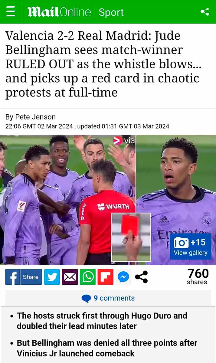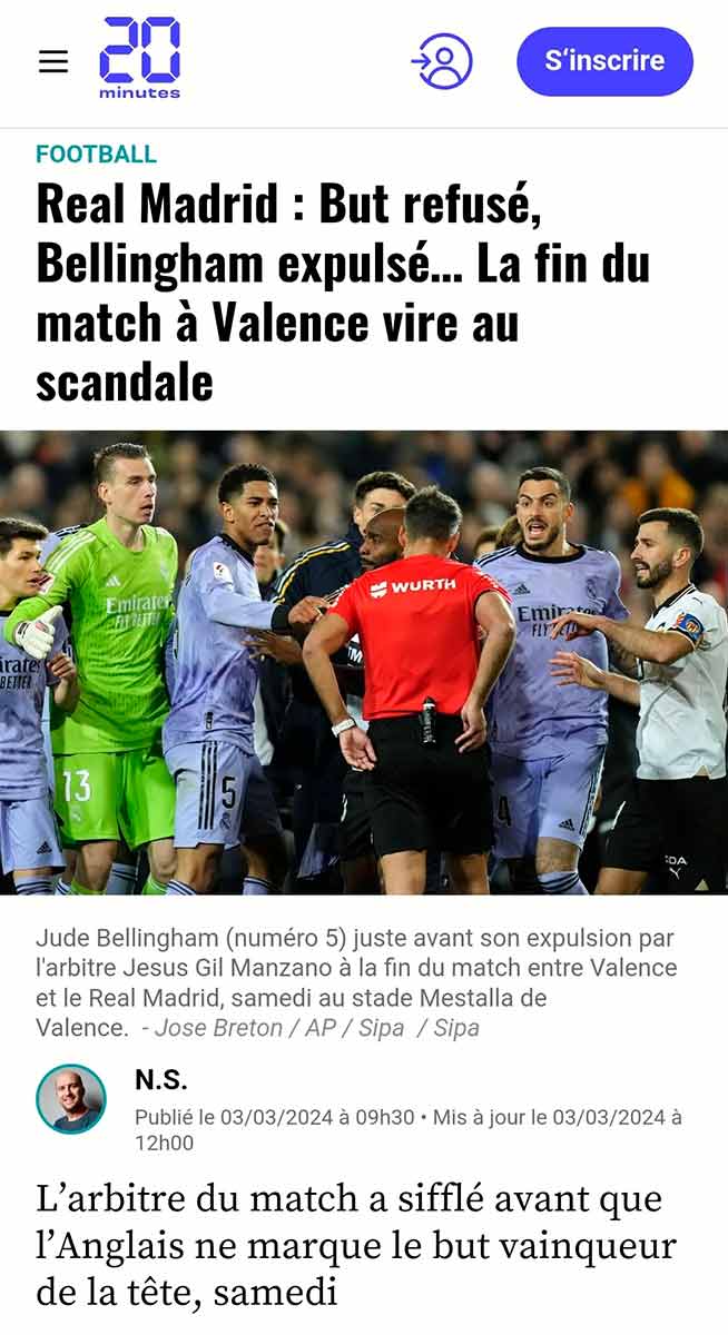 20 Minutes: «Real Madrid: Gol anulado, Bellingham expulsado... El final del partido en Valencia se convierte en un escándalo».