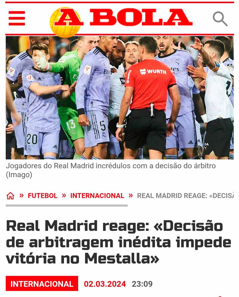 A Bola: «Una decisión inédita del árbitro impide la victoria en Mestalla».
