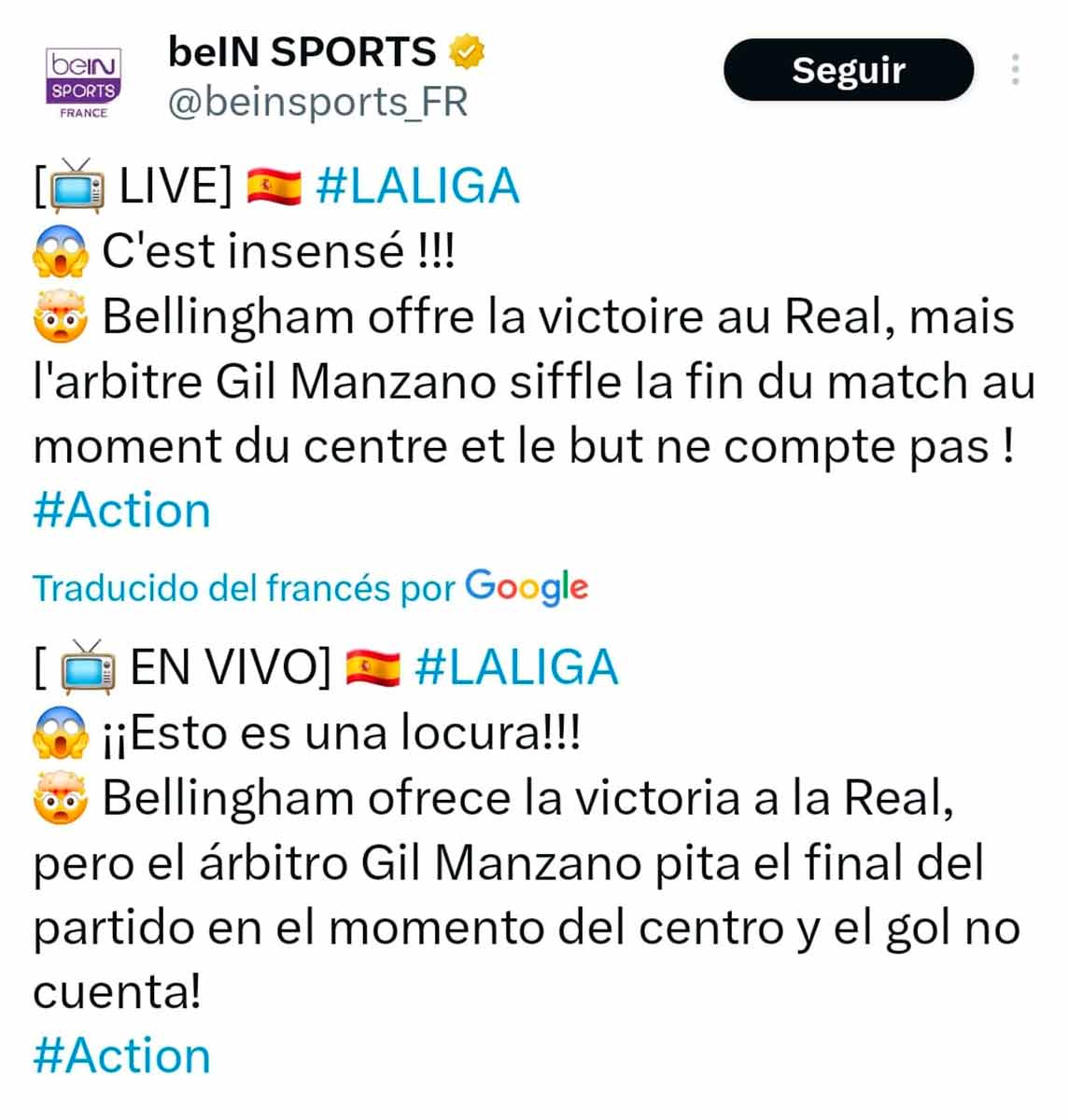 Al CM de la cuenta francesa de beIN SPORTS en X le estalla la cabeza porque Gil Manzano pitó el final del partido en el momento del centro y el gol no contó.