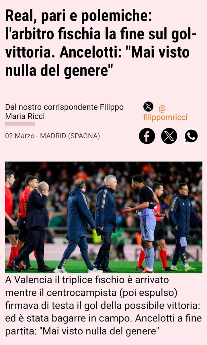 «Es algo inédito» fueron las palabras de Carlo Ancelotti ante los medios cuando le preguntaron por el gol que escatimó Gil Manzano al Real Madrid tras señalar el final del encuentro cuando Jude Bellingham estaba marcando el 3-2. Efectivamente, es inédito, el Madrid y otros equipos ya habían sufrido alguna vez que les decretaran el final en medio de una contra, pero que el árbitro realizase los tres pitidos durante el intervalo de tiempo que transcurre desde que el balón sale de la bota del asistente, Brahim, y se aloja en la red del rival tras el golpeo del rematador, Bellingham, es toda una novedad.