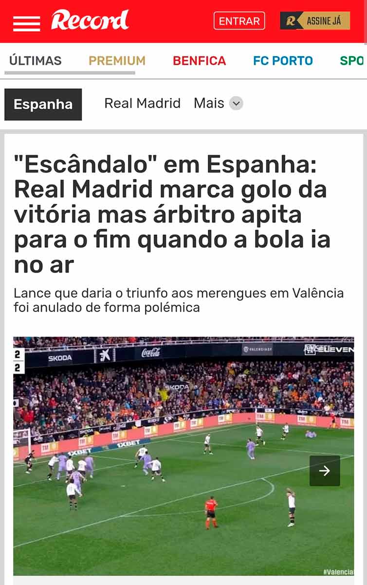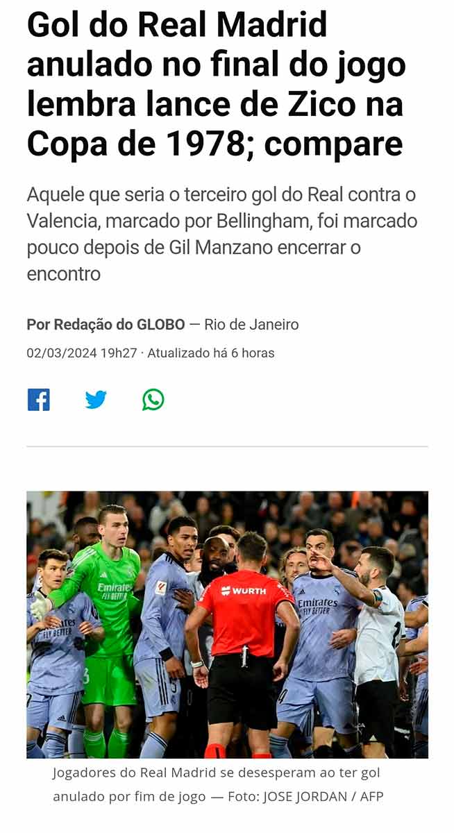 O Globo: «El gol anulado al Real Madrid al final del partido recuerda al de Zico en el Mundial de 1978».