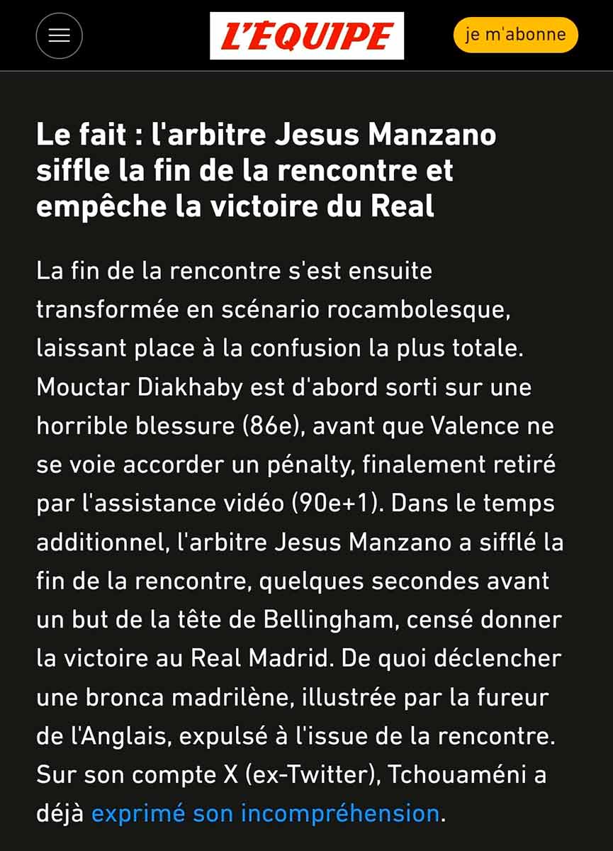 L'Equipe: «El árbitro Jesús Manzano pita el final del partido e impide la victoria del Real». Nítido.