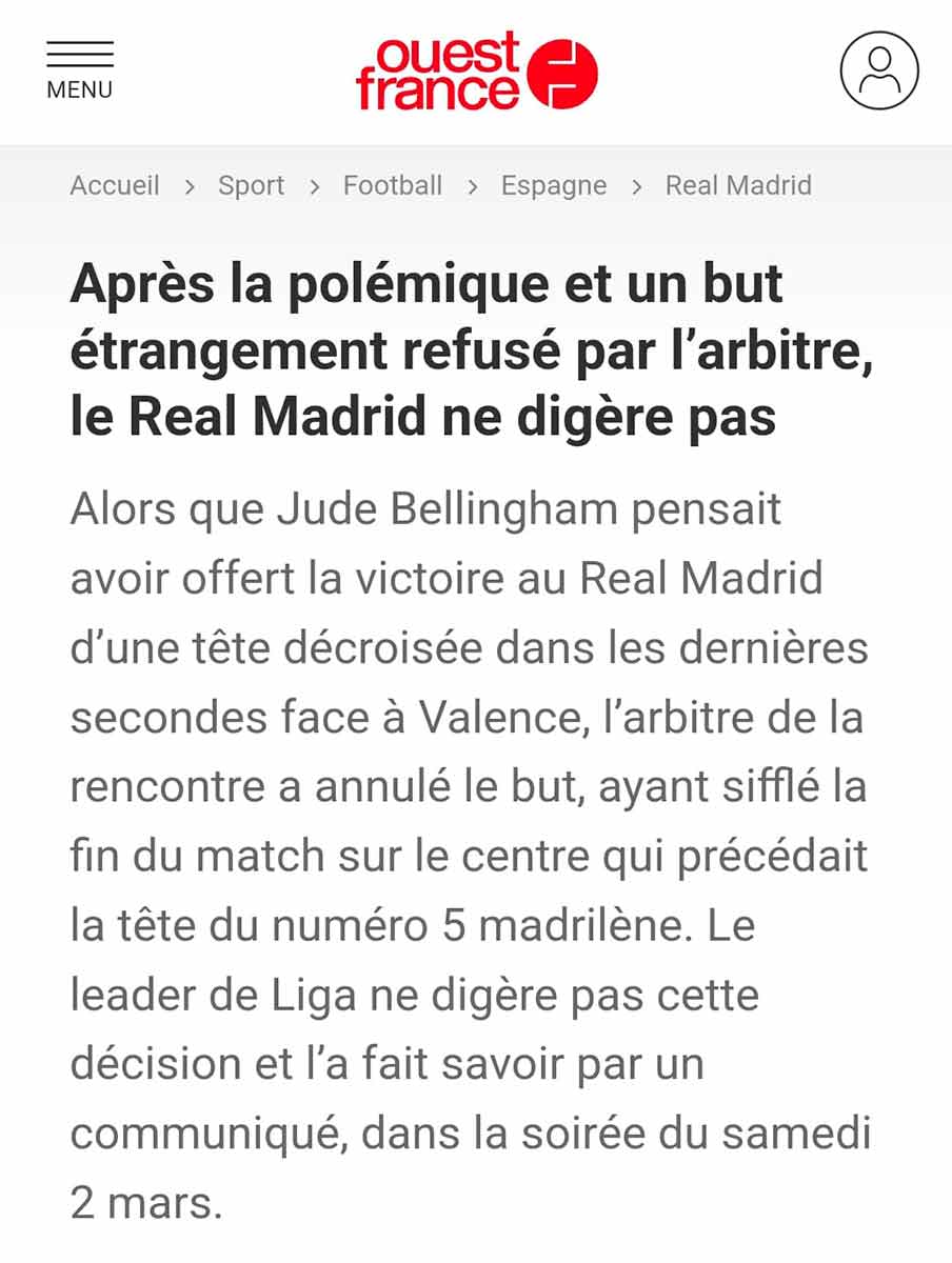 Ouest France habla de gol extrañamente anulado por el árbitro durante el centro que precedió al cabezazo del 5 del Madrid.
