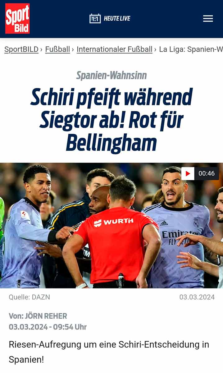 Sport Bild: «¡El árbitro hace sonar el silbato durante el gol de la victoria! Roja para Bellingham».