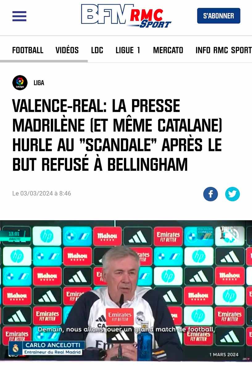 RMC Sport: «La prensa madrileña (e incluso la catalana) grita "escándalo" tras el gol anulado a Bellingham».