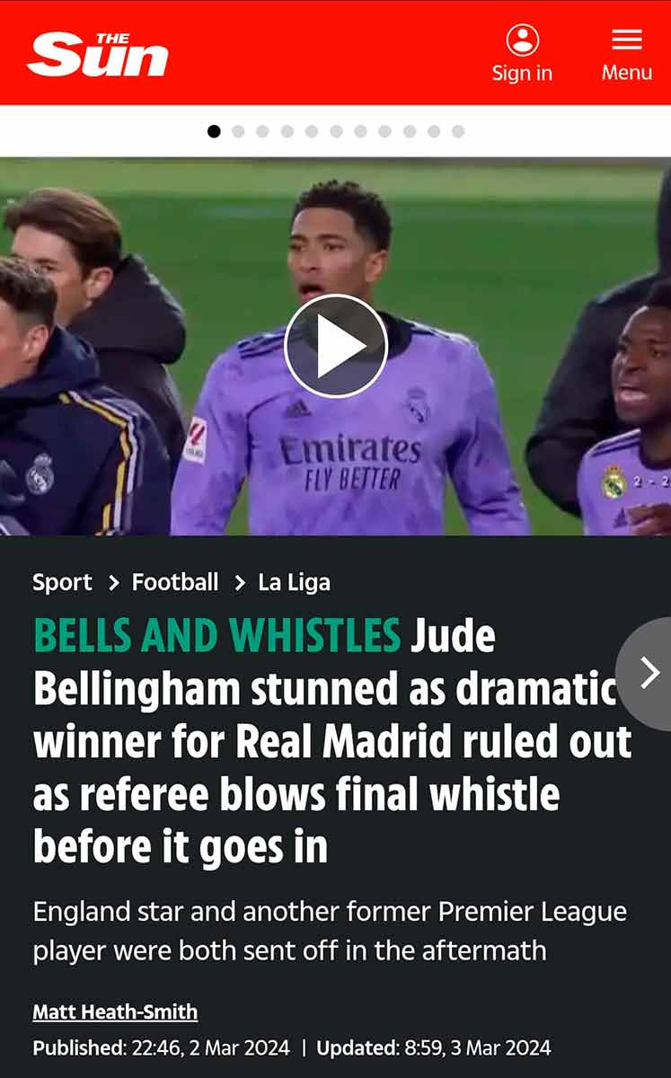 The Sun destaca que Jude Bellingham se quedó atónito cuando el árbitro señaló el final antes de que entrase el tanto ganador del Real Madrid.