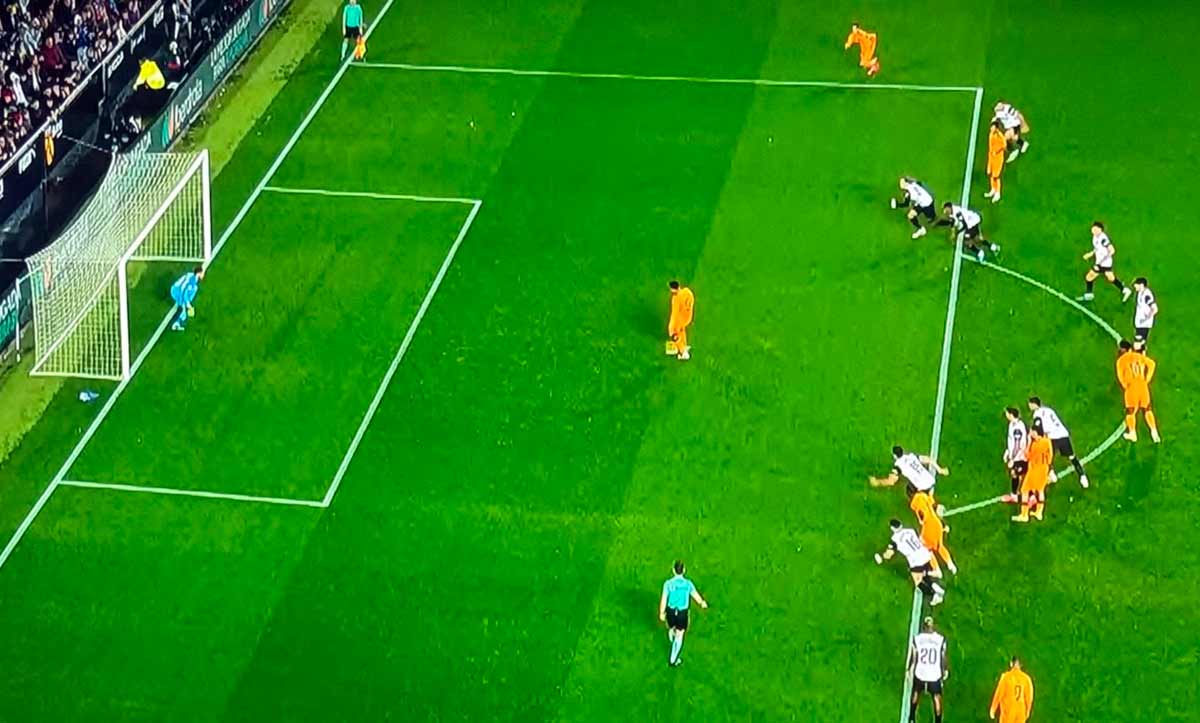 Es difícil pronunciarse sobre la necesidad de haber repetido el penalti que falla Bellingham. El CTA ha enmarronado tanto el panorama con circulares, destinadas a confundir a todo el mundo para incrementar su propia discrecionalidad, que es difícil saber si a día de hoy la doble infracción de Dimitrievski adelantándose y jugadores valencianistas invadiendo al área debería dar lugar a repetición. Pero lo sintomático es la rapidez con la que se reanuda el juego. Muñiz Ruiz está tan ocupado frotándose las manos ante el error de Bellingham que no necesita tiempo para estudiar la posibilidad de que el inglés deba tirar otra vez desde los once metros. Se inhibe de nuevo.