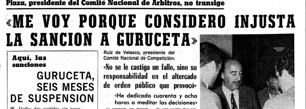 "el penalty de Guruceta" fue un tornado que sacudió los cimientos del fútbol español y se coló hasta la mesa del Consejo de Ministros de Franco y el Gobierno de "Los Lópeces" por originar un conflicto de orden público, acarreando para el árbitro una sanción tan surrealista como abracadabrante: seis meses de empleo y sueldo por equivocarse