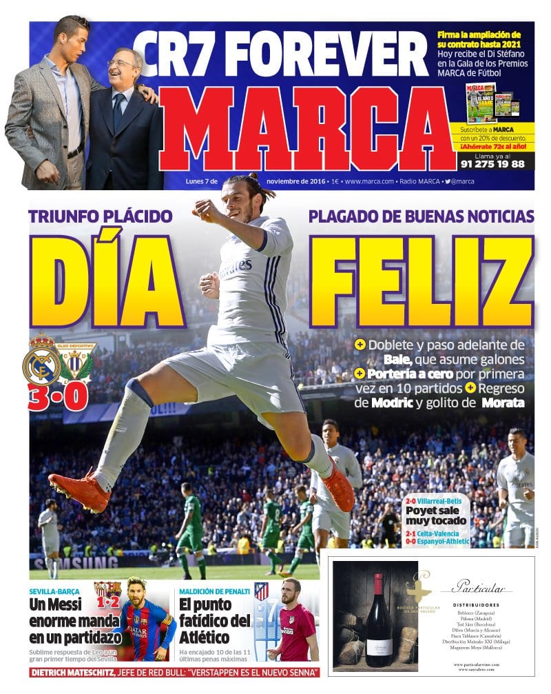 Tanto han cambiado las cosas en el periódico de la persecución interminable que hoy, siete de noviembre, le dan a Bale las llaves del Real Madrid mientras posan sobre él el futuro de la entidad a corto, medio, largo y larguísimo plazo. Casualmente lanzan esta portada el día que Cristiano Ronaldo firmará su renovación hasta 2021. Guiños, los justos. Siempre hay un camino alternativo. El galés ha pasado de irse a ser el líder. Y Cristiano, de ser el mejor a estar "en un laberinto" mientras el club le renueva. En la casa de los líos siempre hay una habitación más.