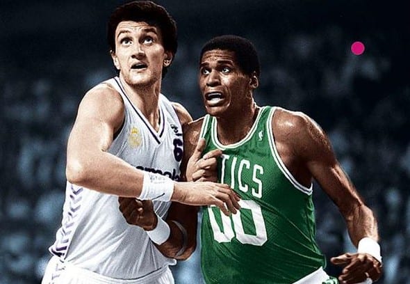 En la foto de arriba está pugnando con el también mítico Robert Parrish.