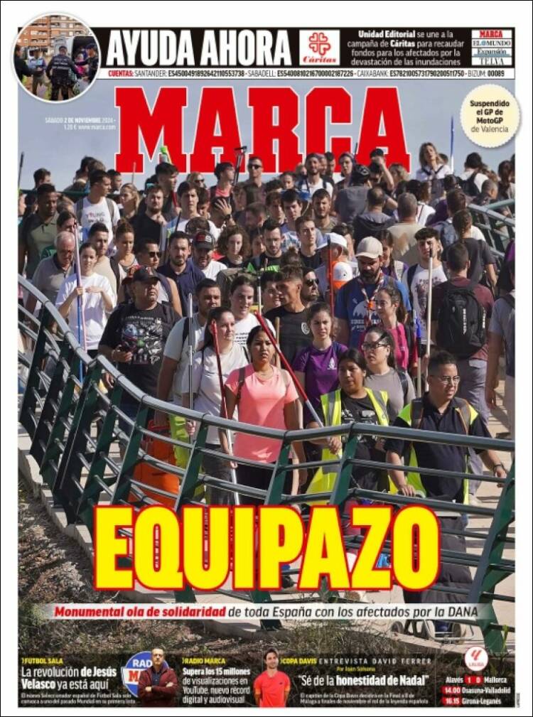 En estos días tan terribles que estamos viviendo, el diario Marca acierta de pleno al olvidar por un momento el fútbol y nos trae una portada de homenaje a esa gente que está supliendo con su esfuerzo y sus ganas de ayudar las carencias de la mala gestión: