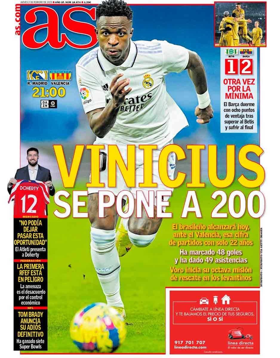 Marca dedica también su portada a esta efeméride. “200 veces Vinícius”, titulan los chicos de Gallardo, que al menos hoy ponen bajo el foco a la estrella madridista sin ánimo de arrojarle a los pies de los caballos para que luego lo “cuelguen” de algún puente o le fría a patadas el Raíllo de turno. Un Raíllo, por cierto, que no sabe vivir sin Vini, porque ayer volvió a hablar del veinte blanco. No puedo vivir sin ti, no hay manera.