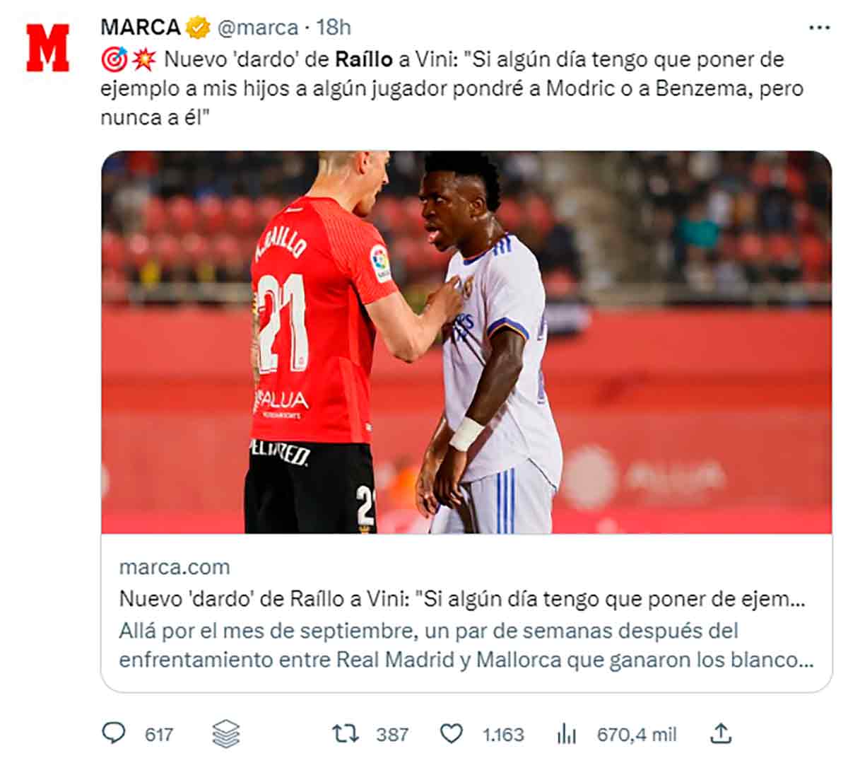 La vida de Raíllo se limita a pegar patadas a los rivales y rajar de Vinícius. Donde no hay mata no hay patata, y el rapsoda mallorquinista es así, no lo he inventado yo. Pero no te preocupes, Raíllo, que si algún día tenemos que poner de ejemplo a nuestros hijos a algún jugador, nunca te pondremos a ti. El sentimiento de asco es recíproco.
