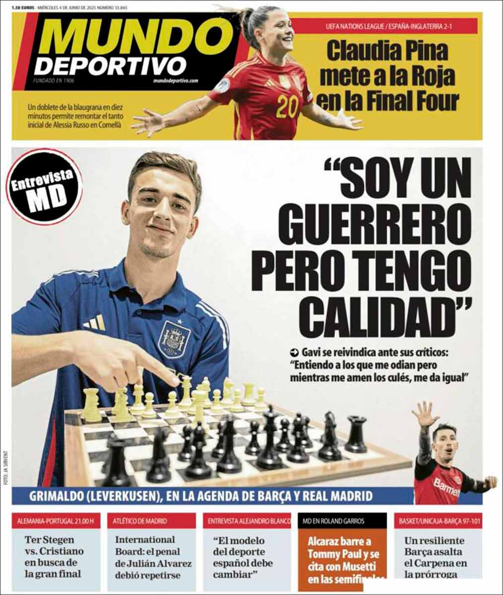 Pasamos a Mundo Deportivo, que hoy inaugura sección: «El club de la paradoja culé». Para tan magno estreno, una imagen demoledora: Gavi junto a un tablero de ajedrez.