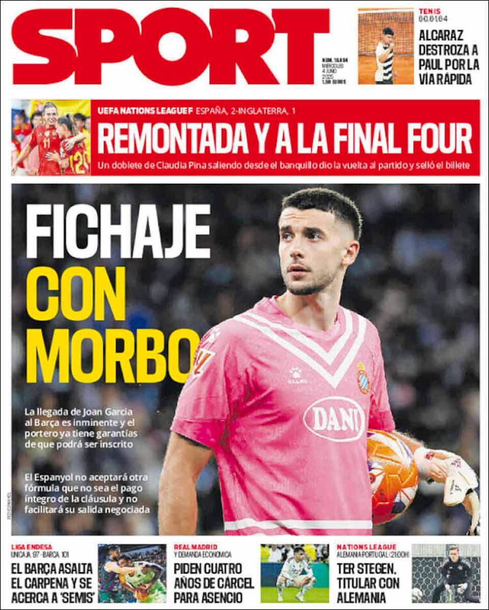 Comenzamos nuestro recorrido por lo séptico con uno de los diarios que más hieden siempre: Sport. «Fichaje con morbo», titulan sobre una instantánea de Joan García, el aún meta del Espanyol. Hoy nadie se esconde, el rubor ha muerto, de modo que pueden anunciar: «… ya tiene garantías de que podrá ser inscrito».