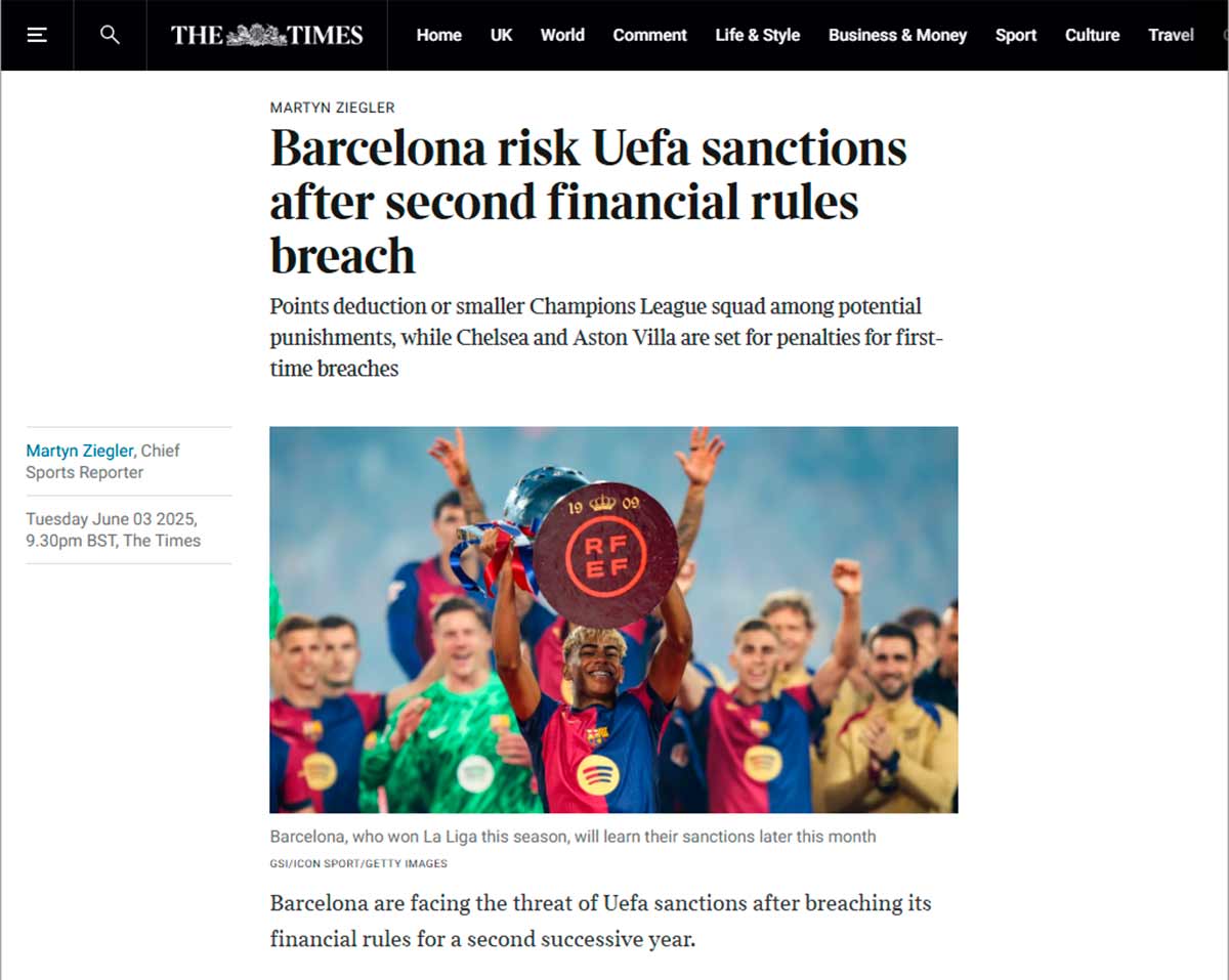 Según The Times, el Barça se arriesga a recibir sanciones de la UEFA tras incumplir por segundo año las normas financieras. ¡Ja!