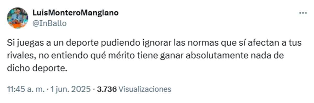 A todos ellos se les puede contestar con esta reflexión del gran Luis Montero Manglano: «Si juegas a un deporte pudiendo ignorar las normas que sí afectan a tus rivales, no entiendo qué mérito tiene ganar absolutamente nada de dicho deporte».