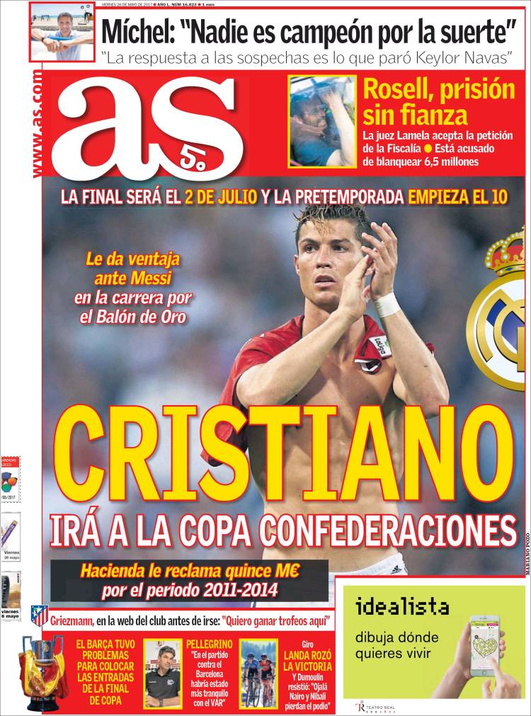 La portada de As se refiere más al aspecto deportivo de Cristiano, aunque lo que nos gusta de esta primera plana es lo que dice Míchel respecto a las incalificables insinuaciones de la prensa culé sobre la derrota de su Málaga que valió la Liga a los nuestros. "La respuesta a las sospechas es lo que paró Keylor Navas". Eso y una buena querella, nos atrevemos a apostillar.