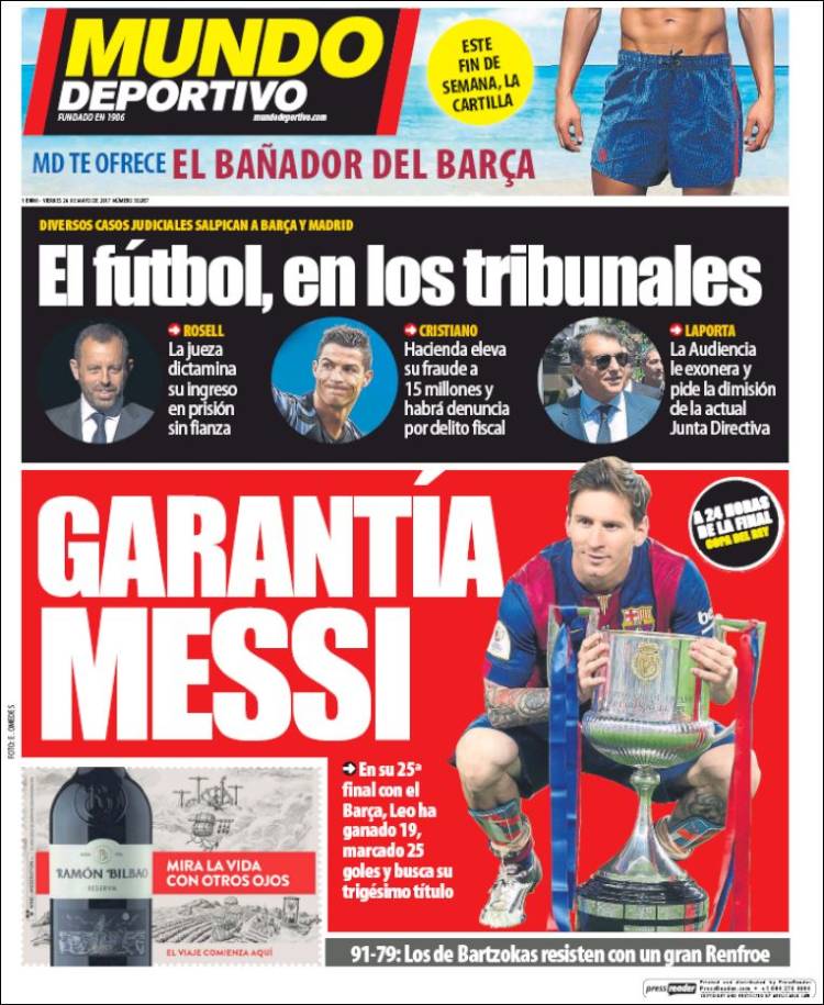 Poco que añadir al Portanálisis de hoy. Yo diría que la portada de Marca. Mas que nada porque es el único medio que, a falta de un día para la final de Copa, saca en portada a algún jugador del Alavés...