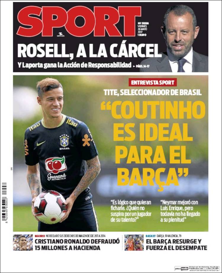Sí, amigos. Cuando ganan ellos gana el fútbol, y cuando ellos van a la cárcel va a la cárcel el fútbol. Es una jugada maestra. El fútbol son ellos, y hay una granítica coherencia en todo esto. Sport, en cambio, tiene el curioso arranque de honestidad de presentar la verdad como es: Rosell, a la cárcel. ¿Y Cristiano?, se preguntará decepcionado el ávido lector de Sport.