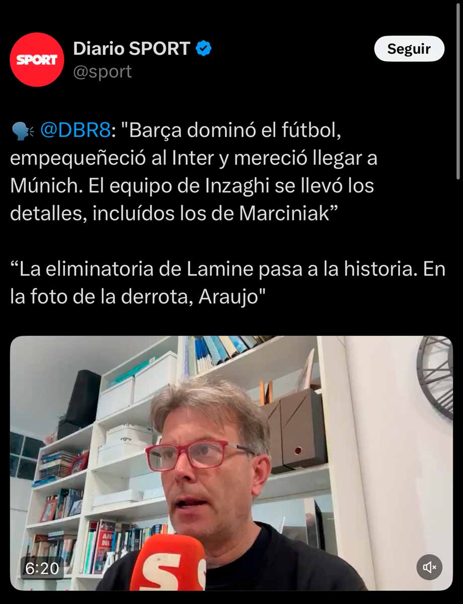 —En este vídeo pueden ver al culé más moderado ejerciendo de comentarista en Barça One llamando al autor del tercer gol interista “impresentable” o “quinqui” entre otras lindezas antes de aseverar que no tiene cabeza y por eso se dedica a lo que se dedica.