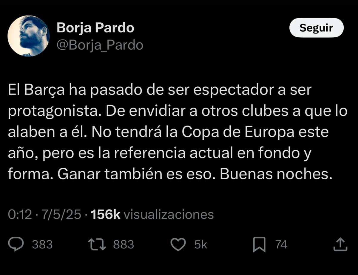 —Les digo que incluso el Gobierno está de lado de un club que ha demostrado no tener pudor alguno a la hora de incumplir cualquier regla o ley que se le ponga por delante. Miren este tuit que se escribió tras la derrota del Barcelona desde la cuenta del CSD.