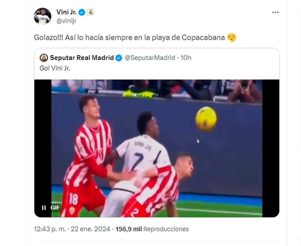 Entonces, cuanta más profunda era mi desazón, me topé en la red social X con una foto de Vinicius Jr. marcando su gol con el hombro contra el Almería. Lo extraordinario de aquella foto era que la había reposteado el propio protagonista, Vini, añadiéndole el siguiente comentario: