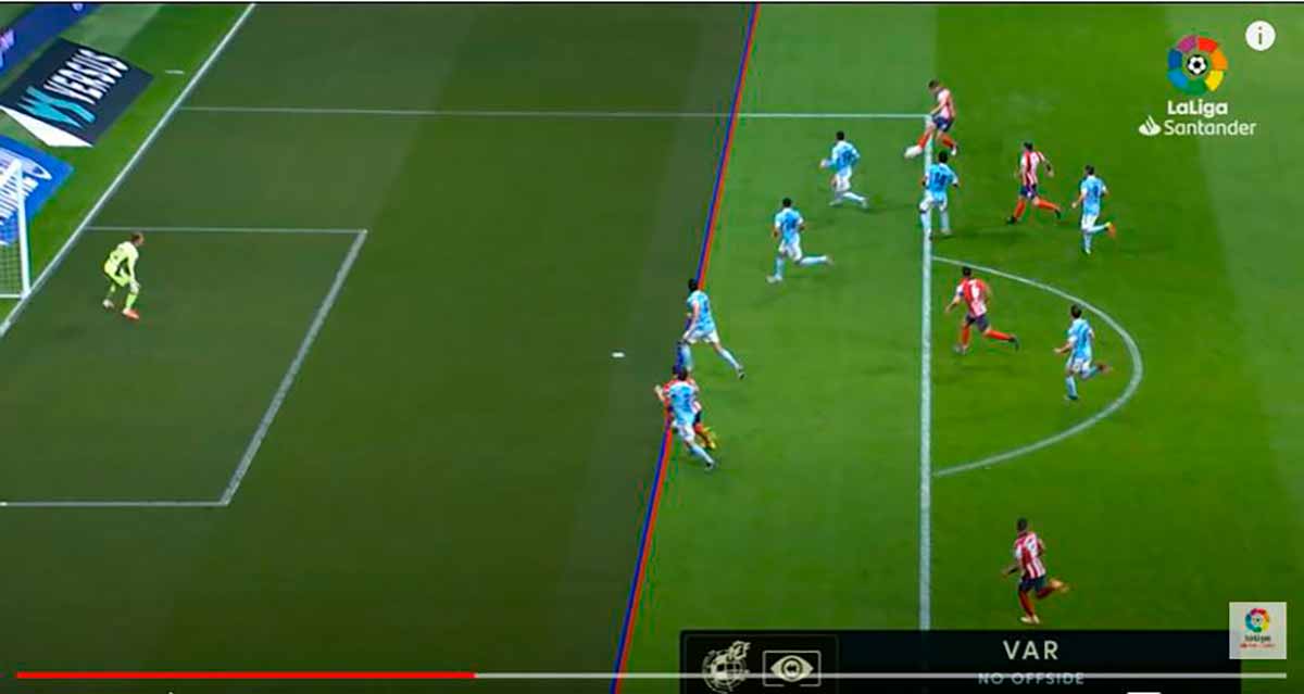 En el segundo gol se da la circunstancia de que tampoco se aprecia al pasador en el frame seleccionado, pero es que además, no parece que el balón haya salido de la bota de Kondogbia. Nacho Tellado, el llamado en su día “arquitecto del Chiringuito”, concluyó que aquel gol había sido concedido de manera injusta, puesto que Lodi estaba más adelantado que el defensa celtiña: